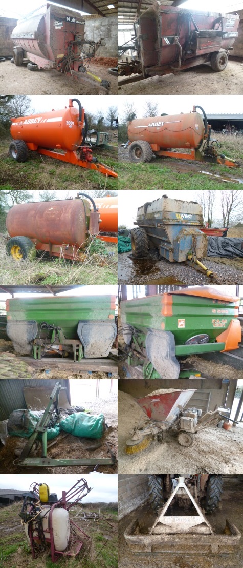 Bateman Cattle Crush; Wopa Cattle Foot Trimming Crush; Cattle Crush; Metal Gates & Hurdles to make Calf Pens etc; 2 Electric Cow Brushes (Not Working); 3 John PollockWooden; Cow Brushes; 9 John Shepherd 15ft Cattle Feed Barriers & Troughs; 6 400 & 500 Gallon Concrete Water Troughs; 20 Tonne Mollasses Tank & Stand (approx. 8 years old); 10 Tonne Mollasses Tank & Stand (approx. 15 years old); 8-10 Tonne Freestanding; Cake Bin; 20 Wydale Calf Feeders; 2 Hook on Metal Calf Feeders; 6 3 Teat & 10 2 Teat Plastic Calf Feeders; Heavy Duty Calving Aid; 3 Plastic Footbaths (2 Large/ 1 Single); 2 Cattle Round Feeders; Cow Hoist & Cow Belly Hoist