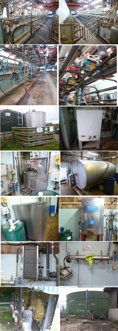 Fullwood 22/44 Swingover Herringbone Milking Parlour c/w Vaccar MM85m Clusterflush, Separate Dumpline for Antibiotic Milk, Separate Jet Line, 2 Reception Tanks, Feed Troughs & Steelwork; 14,500l Vaccar Bulk Milk Tank c/w Compressor, Loheat Water Heater & Washer; 8,400l Fabdec Ltd Dari-Kool Bulk Milk Tank; Fabdec Ltd Dari-Kool 100kw Ice Builder (needs new pump); Cotswold Water Heater c/w Stand; Double Plate Cooler (Mains Water & Ice Builder Water); Milk Filter; Volume Washer Pump; Heat Exchanger; Draper 150l Compressor (for Cluster Flush); 2 Fullwood Compressors (to run Parlour); 2 Compressors (for Ice Builder & 8400l Tank); Goossen-Moover 24ft Electric Backing Gate; Kovec Foam System; 57 Rubber Parlour Mats (25 Large/ 32 Small – all approx. 4 years old); 16 Old Parlour Feed Hoppers; Parlour Roll